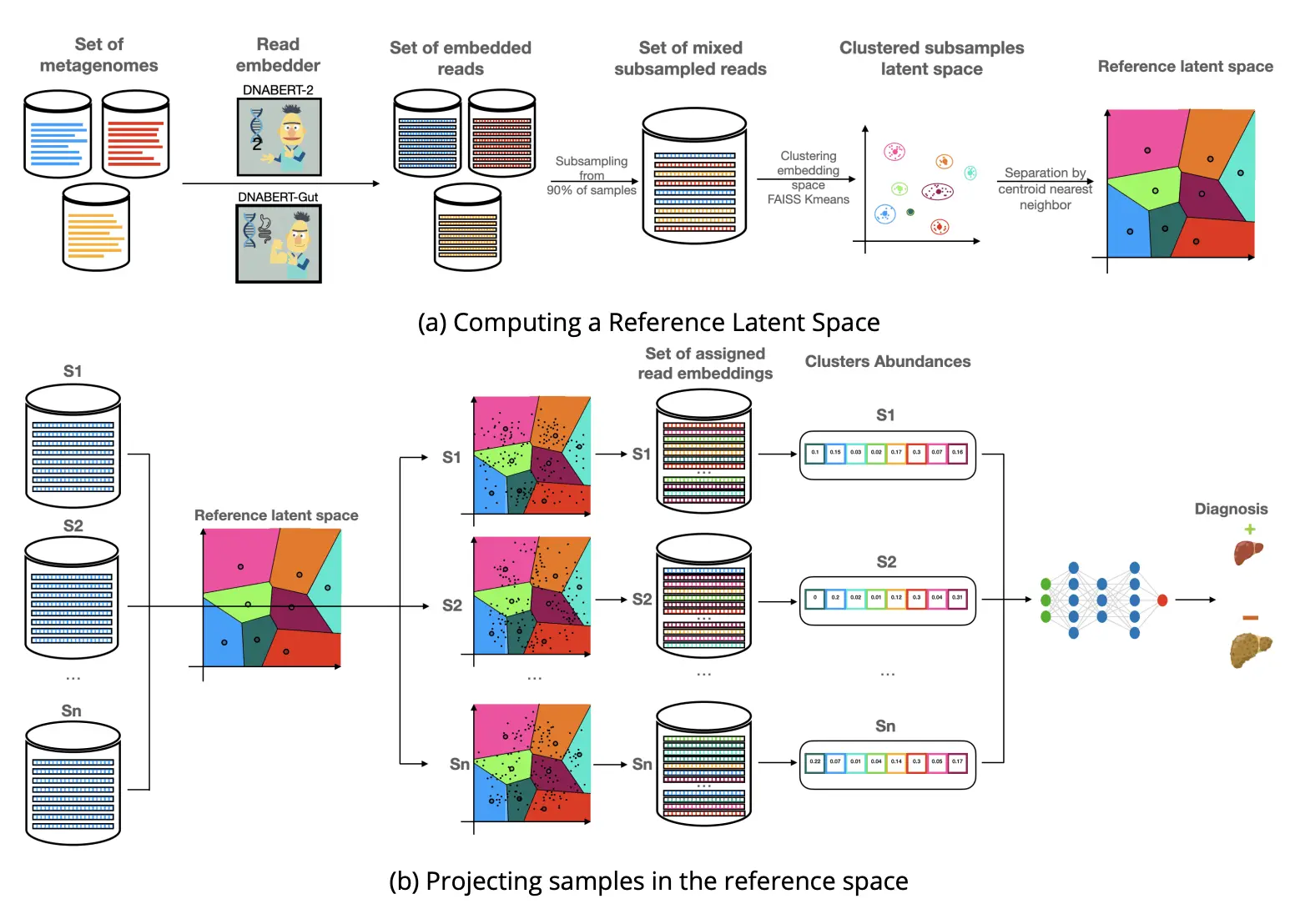 Mean pooling was applied to produce one embedding per read, and only 10% of reads per sample were used to reduce computational cost while maintaining the performance; hence, each metagenome was represented by millions of 768-dimensional read embeddings. Further, to summarize all of this, large data clustering was performed using a global K-means algorithm implemented with FAISS for efficient GPU computation, so each metagenome was then represented as a cluster abundance vector by assigning reads to the nearest clusters. A LASSO classifier was used for disease classification based on species abundance cluster-based embedding and their combinations.