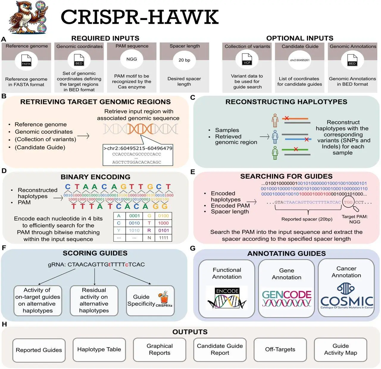 CRISPR-HAWK is a command-line tool that designs, scores, and annotates CRISPR guide RNAs while accounting for real human genetic variation. It employs massive population databases to rebuild individual genomes, so guides are chosen based on a person’s real DNA rather than just the reference genome. The tool looks for guides in user-defined genomic regions, predicts how well each one will work, checks for off-target effects, and includes genetic and functional annotations.
