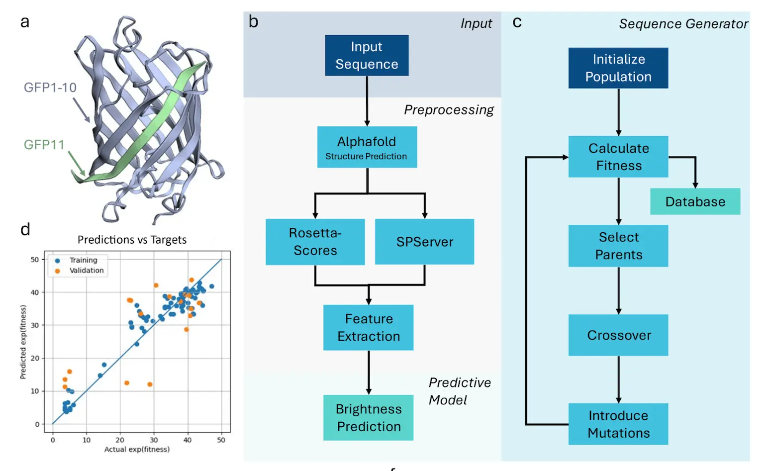 The split Green Fluorescent Protein (GFP) system demonstrated the power of MDMI. In this model, a small peptide known as GFP11 associates with a larger fragment, GFP1-10, and they form a fluorescent protein together. This configuration allows a straightforward functional assessment of the peptide, which makes it a perfect test case for the platform. The team simulated the structures of over 1,300 different variants of GFP11 and executed their scoring system to project the most successful candidates. Then, they employed the genetic algorithm to create new sequences and settled on 40 frontrunners after laboratory testing.